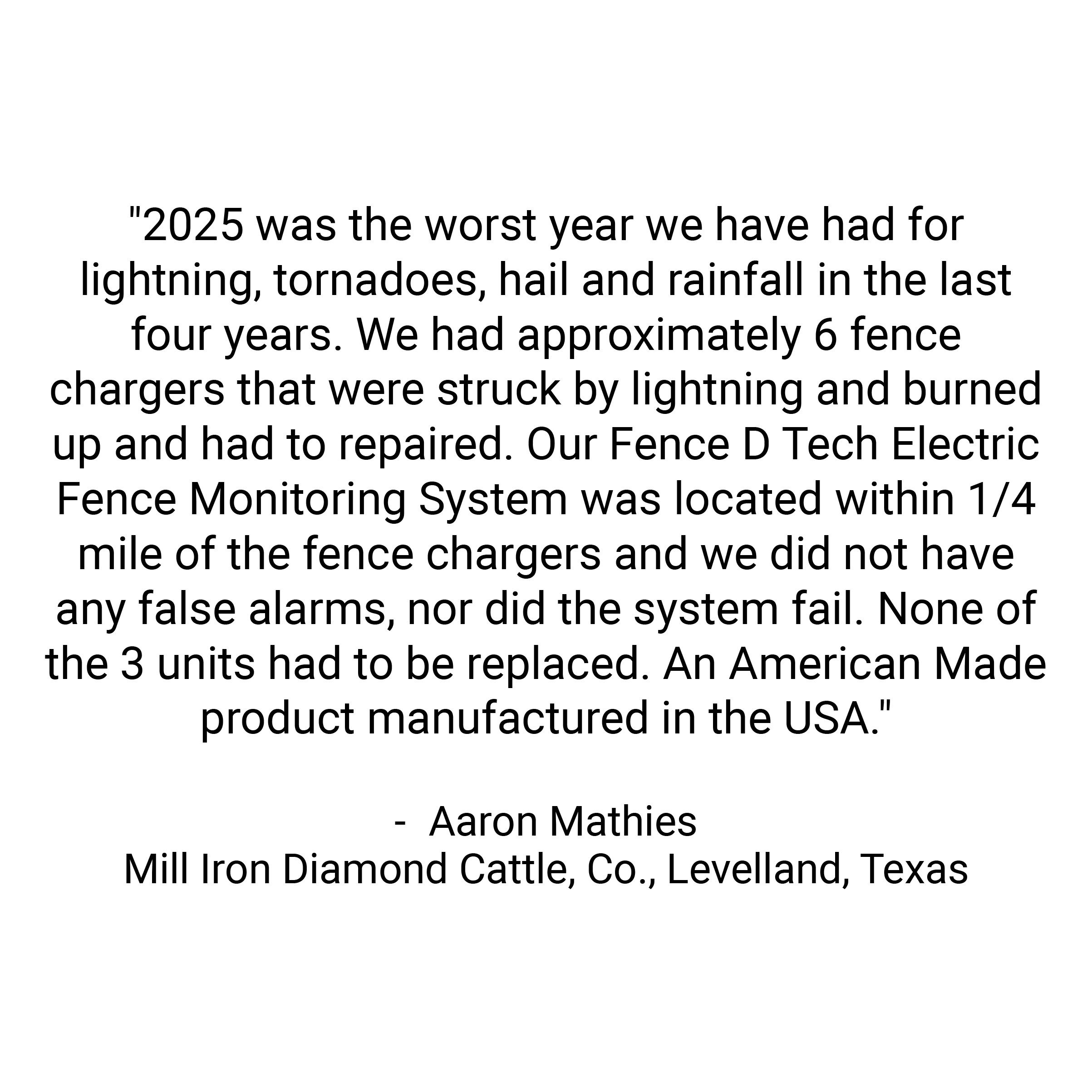 Fence D Tech™ uses cellular communications* to alert of a change of state in the fence within 30 seconds when installed on the end of an electric line and the fence is either turned off, broken, or shorted, depending on cell tower coverage. Allows livestock owners and managers to better manage daily tasks when fence assets do not need to be inspected.